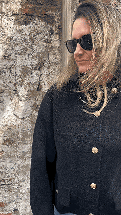 "The gold buttons make this jacket special - I feel put together instantly. Bought both Camel and Black for my capsule wardrobe!" – Sophia, 45